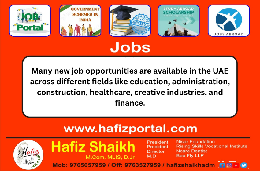 Many new job opportunities are available in the UAE across different fields like education, administration, construction, healthcare, creative industries, and finance.